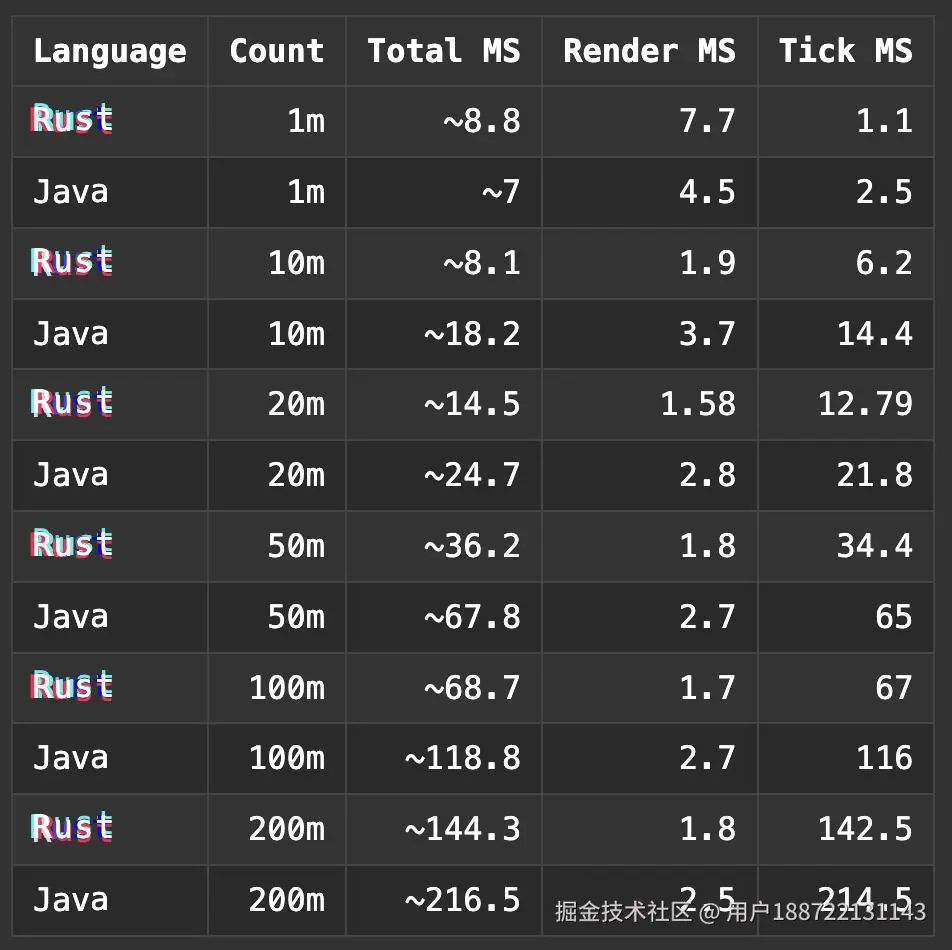 有意思的是,在 1 百万粒子时,Rust 似乎渲染时间更长,我这边多次测试都能复现,但原因我不清楚。