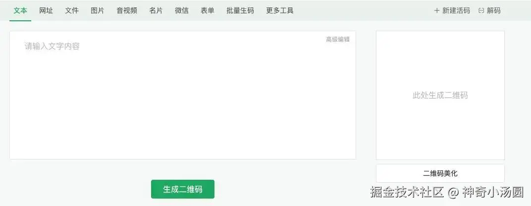 在左边的输入框就可以输入你的内容,它可以是文本、网址,文件........。然后就可以生成代表它们的二维码。你也可以把二维码上传,进行”解码“,然后就可以解析出二维码代表的含义