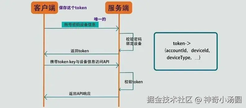 - 服务端就可以通过 token 找到与它绑定的账号与设备信息,然后把绑定的设备信息与客户端每次传来的设备信息进行比较, 如果相同,那么校验通过,返回 AP 接口响应数据, 如果不同,那就是校验不通过拒绝访问。