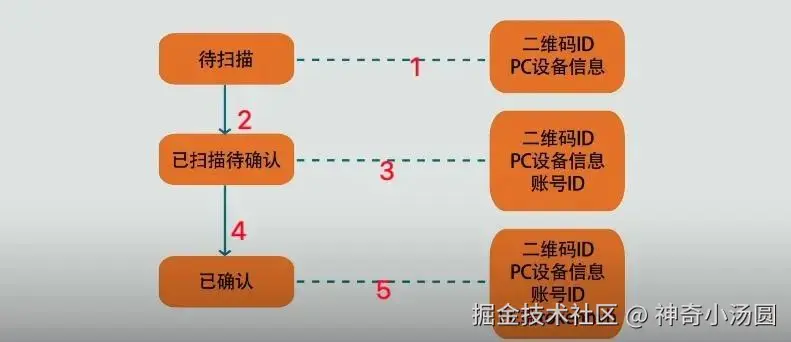 - 二维码的背后它一定存在一个唯一性的 ID,当二维码生成时,这个 ID 也一起生成,并且绑定了 PC 端的设备信息