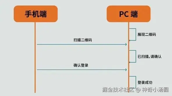 从前面这个流程,我们可以看到,客户端不会也没必要保存你的密码,相反,它是保存了 token。可能有些同学会想,这个 token 这么重要,万一被别人知道了怎么办。实际上,知道了也没有影响, 因为设备信息是唯一的,只要你的设备信息别人不知道, 别人拿其他设备来访问,验证也是不通过的。可以说,客户端登录的目的,就是获得属于自己的 token。那么在扫码登录过程中,PC 端是怎么获得属于自己的 token 呢?不可能手机端直接把自己的 token 给 PC 端用!token 只能属于某个客户端私有,其他人或者是其他客户端是用不了的。在分析这个问题之前,我们有必要先梳理一下,扫描二维码登录的一般步骤是什么样的。