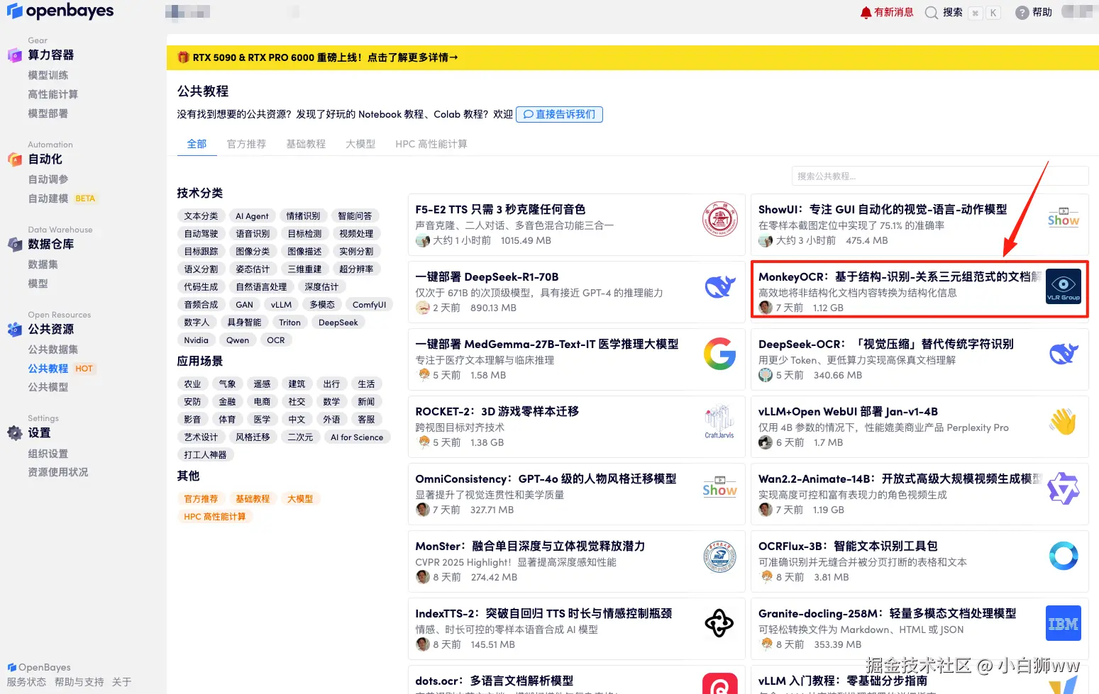 首先点击「公共教程」,找到「MonkeyOCR:基于结构-识别-关系三元组范式的文档解析」,单击打开。