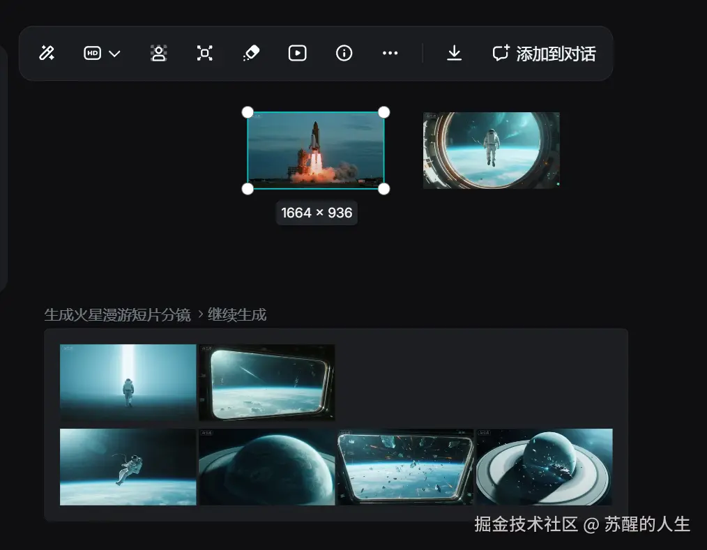 无限画布让我们无需开启多个对话打断思路,而且点击图片和视频结果时,顶部都会出现不同的快捷功能栏。