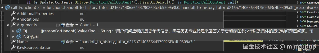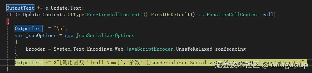 OutputText += $"[调用函数 '{call.Name}',参数: {JsonSerializer.Serialize(call.Arguments)}]";