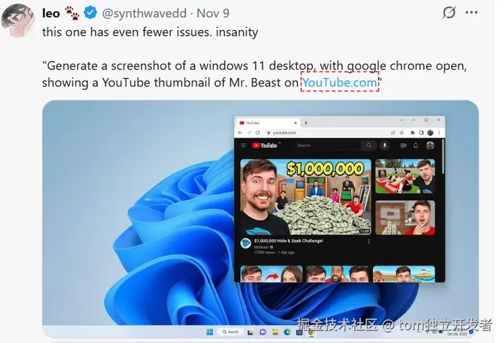 一位用户展示了模型生成的完整YouTube网页界面截图,包括浏览器窗口、地址栏、标签页和内容区域,所有文本都清晰可读,布局合理。如果不是事先知道,我肯定会以为那是一张真实的截图。这包括: