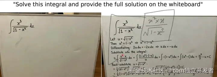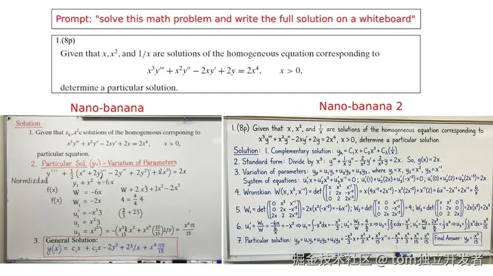 提示词:"求解微积分,并在白板上解题",Nano banana2给出了正确的解题过程和答案,经过网友验证步骤发现只错了一个数字。Nano banana2能够理解题目并进行复杂逻辑推理,模拟手写字体书写分数、积分符号、行列示等复杂数学符号,排版清晰,流程完整,答案正确。