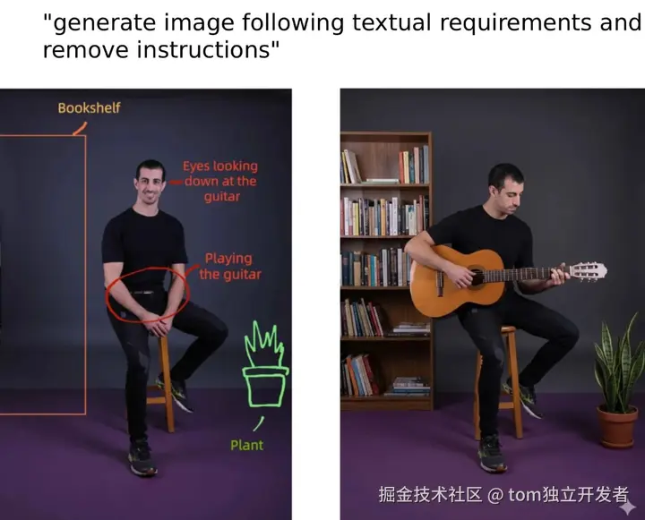 模型能够识别图片上添加的提示框和文字说明,精确执行其中描述的生成要求(如"看向下方的吉他"),并在最终输出中自动移除所有指令元素,生成一张"干净"的成品图像,实现从带注释的草图到完整作品的自动化转换。