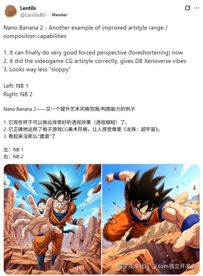 NB1和NB2的对比,能清晰看到 NB2 的提升:它不仅做出了更自然的透视缩短效果(如伸出的手更贴合动态空间感),还精准还原了《龙珠:超宇宙》的游戏 CG 美术风格,线条更利落、动感特效更贴合原作,同时画面精细度更高,没有 NB1 那种略显杂乱的笔触与比例失调感,整体完成度、风格还原度都显著优于前者。