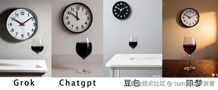 - 精准的时间概念: 由于商业产品摄影的标准,时间通常默认10:10这也导致许多图像模型不能在时钟上显示正确的时间。当你要求Nano Banana 2(GemPix 2)生成“11:15 on the clock and a wine glass filled to the top”时,它能精确计算时针与分针的位置关系,给出一个在物理上正确的时间显示。正是模型内部构建了关于时间流逝和钟表运作机制的抽象模型,顺利通过时钟和装满杯红酒测试。