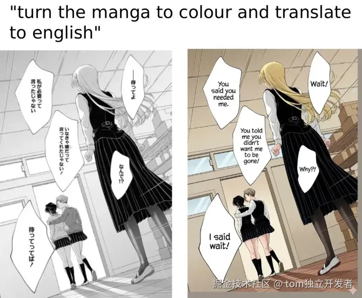 它为单色漫画画面板添加了色彩,正确翻译了所有日语对话,并完美重绘了对话气泡。这就是语言理解、视觉修复和布局精度的结合,全部一次性完成。