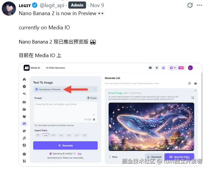 Nano Banana(Gemini2.5Flash Image)刚发布两个多月又要更新新版本?就在11月8日有个网友在一个第三方平台Media.io发现了一个名字为“Nano Banana 2 Preview”预览模型,上线一小时便火速下架。与前代相比,它在生成速度和质量上都有明显进步: