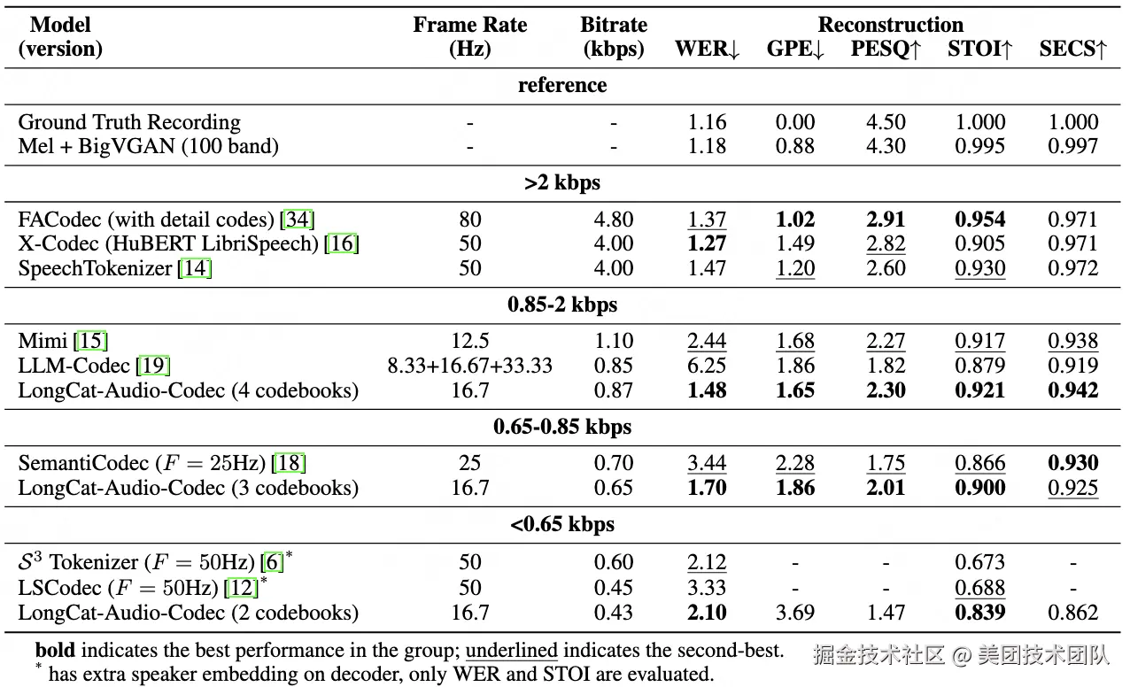 - <0.65kbps 区间(2 个码本,0.43kbps):WER 2.10,STOI 0.839,在极端低比特率下仍保持高可懂性,适合资源受限场景。