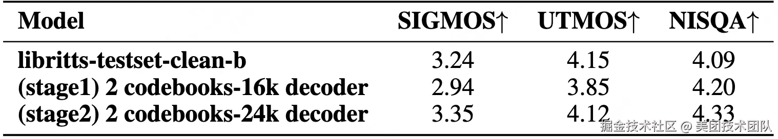 经过 Stage 2 优化后,LongCat-Audio-Codec 在音质上表现突出,无参考音质指标 SIGMOS 3.35,NISQA 4.33,甚至超过 LibriTTS clean 数据集(SIGMOS 3.24、NISQA 4.09)录音水平: