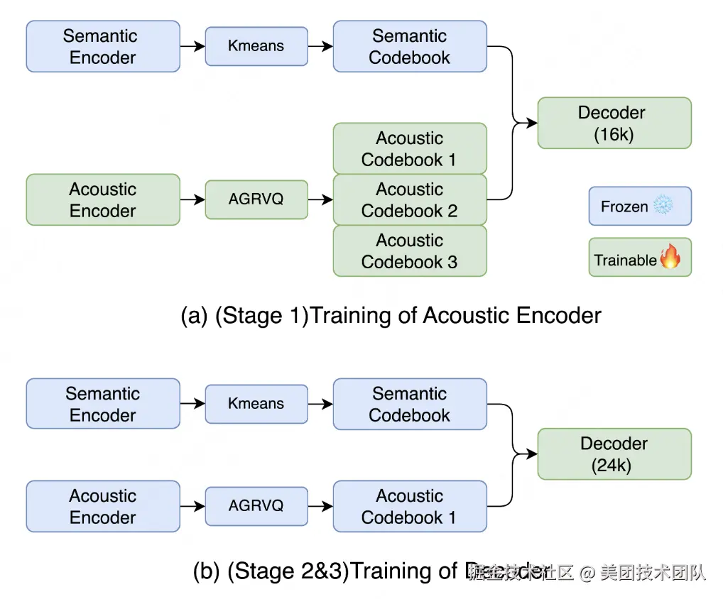 LongCat-Audio-Codec 设计了多阶段的训练策略,来兼容压缩率和音质的需求。其中 Stage1 用于满足高压缩率下的重构需求,Stage2 用于满足高音质合成需求,Stage3 用于满足个性化定制需求: