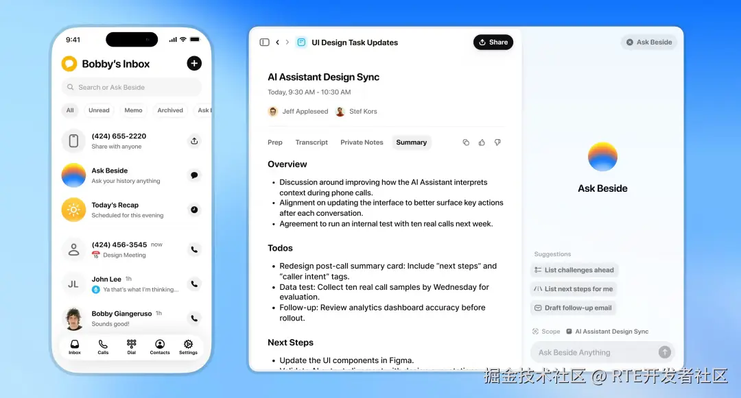 「AI 智能体前台」核心功能:通过一个连接到现有电话号码的应用程序,AI 智能体能够自动接听电话、记忆客户细节、预约、处理后续事宜,并支持自定义语音克隆及文本对话。所有交互均被转录和可搜索,为小企业建立「第二大脑」。