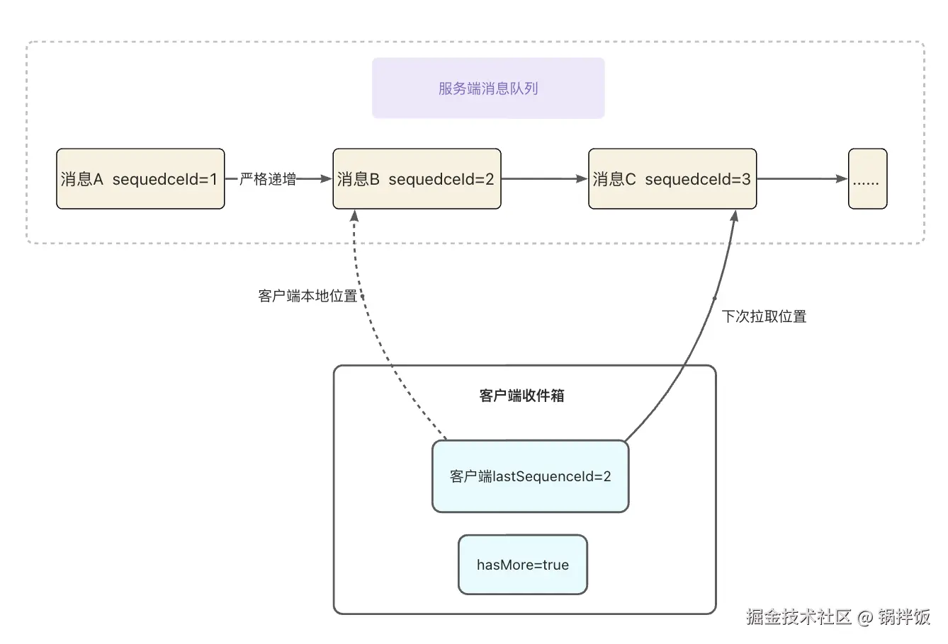 lastSequenceId,服务端响应式会返回新的lastSequenceId+hasMore。 -