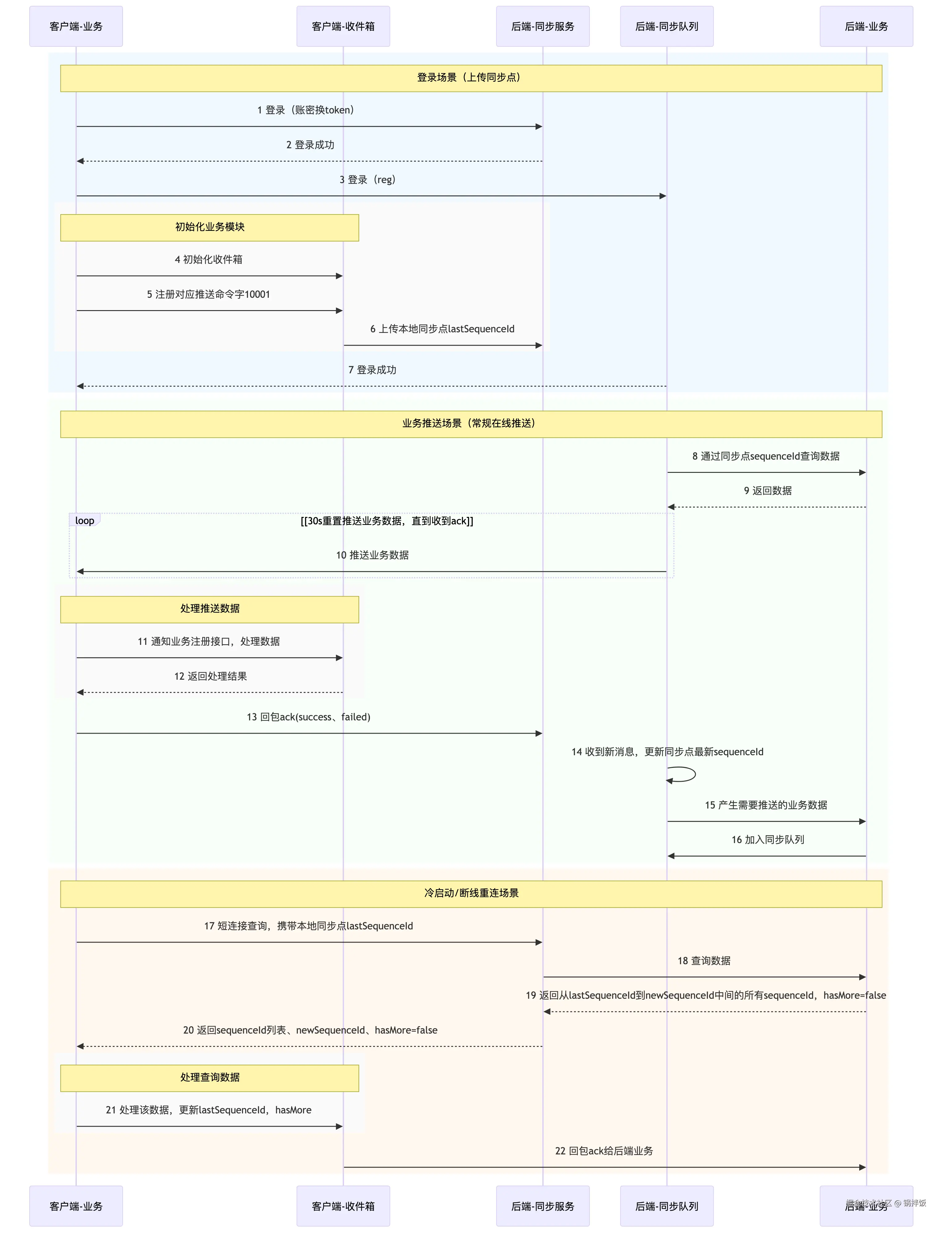 登录/重连/冷启动时: 增量拉取,快速同步离线期间的数据