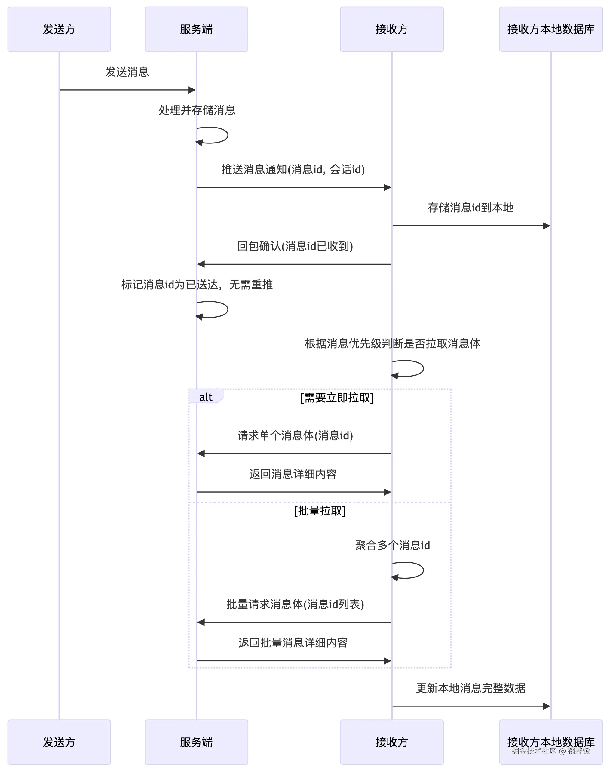 在上面的数据结构中,sequenceId是递增的(跨会话全局递增)。这个会有服务端保证,一般会分布式集群,会采用雪花算法(你可能听说过雪花算法)等方式生成,保证sequenceId的递增、唯一性。