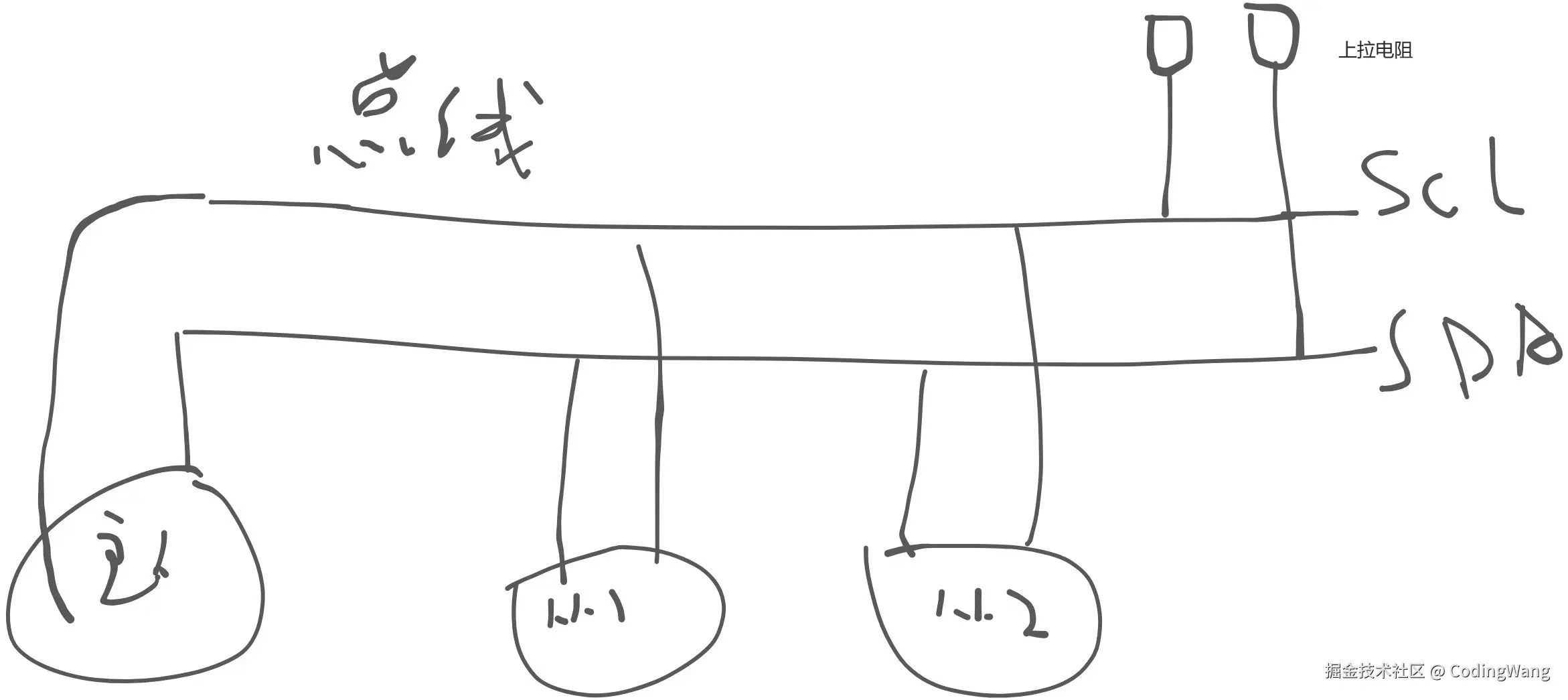 I2C(Inter-Integrated Circuit),通常简称为IIC。它是一种串行同步数据总线,主要有两根线,SDA(数据线)和SCL(时钟线),SCl必须是主设备产生,SDA主从设备都可以。