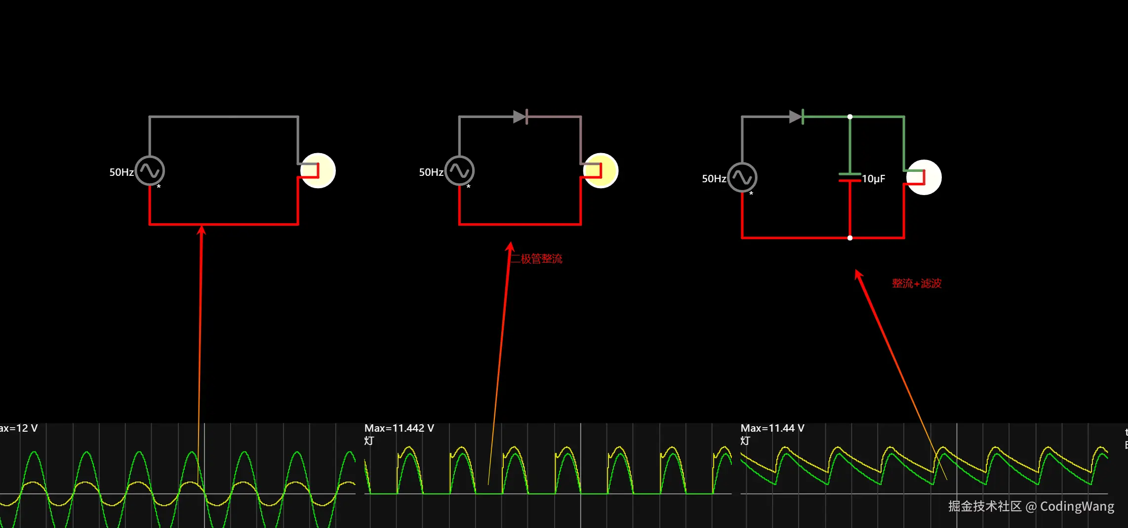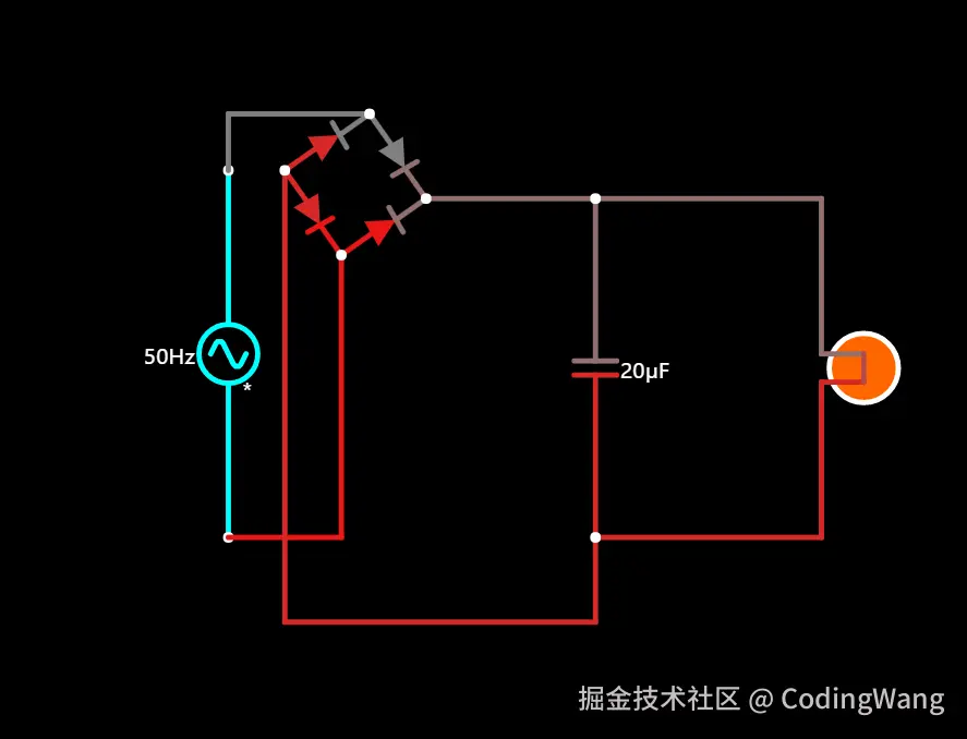 当电流方向改变时,由于二极管的存在,反向不可以导通,但是电容这个时候会释放电流,从而会使得灯泡不会熄灭。电容并联在电源两端,电容会接替交流电的负半个周期进⾏放电,⼩灯⼀直处于常亮状态。