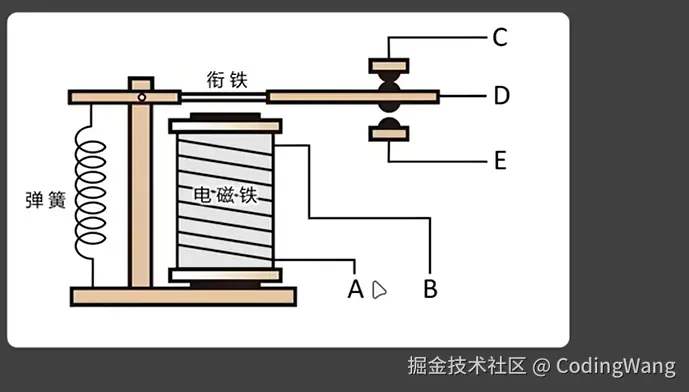 ab接电使得磁铁具有磁性,从而控制cde的通断