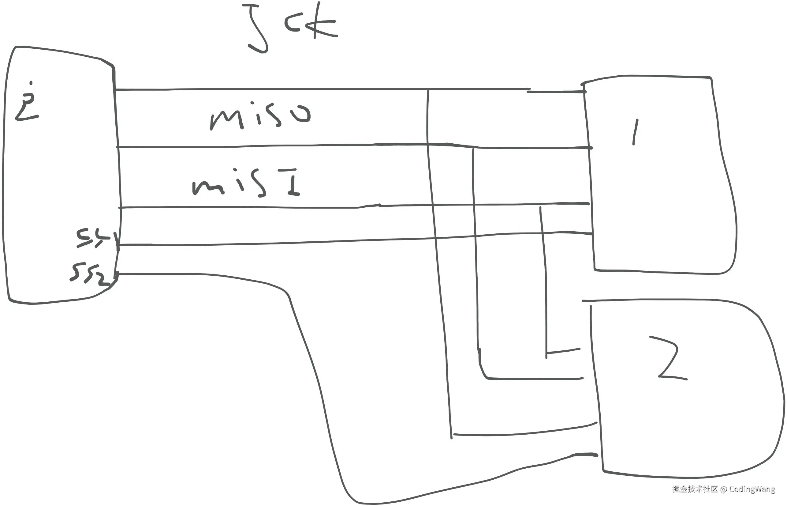 通过上图可以看到,主从公用的三根线包括sck、miso、misi,只有片选是每个设备独立的。