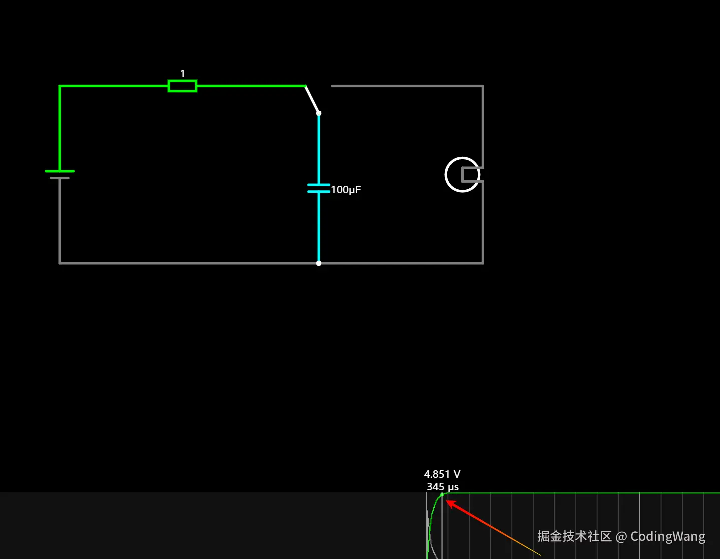 当电容器完全充满时,它两端的电压,和电源电压相等,不会再有电⼦被压⼊极板,
