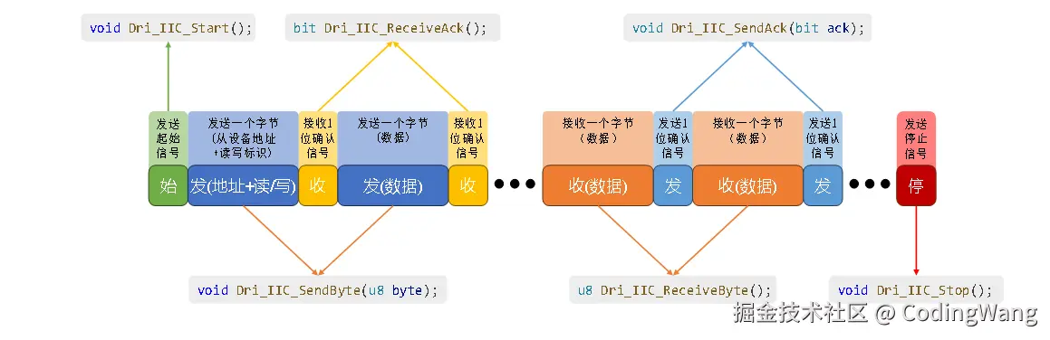 I2C是主从架构,由于只有两根线,空闲时,两根线默认都是给高电平, 当有数据通讯时,SDA会切换成低电平,这个是起始信号,并且每个设备是有设备地址的,当主设备发送给从设备1个字节的数据时,从设备会回复一个确认限号,为0表示收到数据,我们称之为ack,1表示没有收到或者不想在收到数据了,我们称之为nck,当数据完成发送时,会发送一个停止信号,即sda为由低电平到高电平。下面是完整的通讯流程: