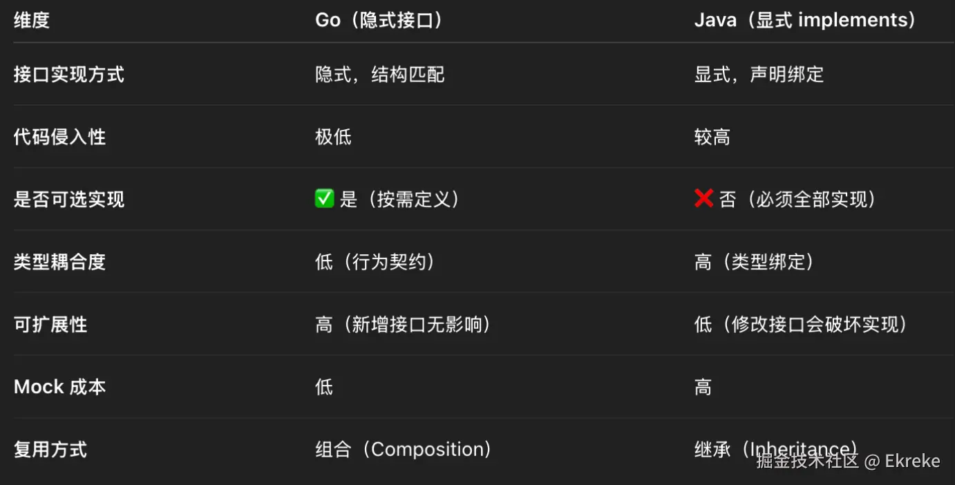 这里采用了模版方法设计模式。在之前定义了生命周期的相关接口和方法,在Run方法中会使用类型断言来查看是否已经实现了TearDownTest interface,如果实现了,就调用interface中定义的方法。 在go中,对于一个interface ,我们不需要显式的去implement定义它的实现,而是采用非侵入性接口(Implicit Interfaces)+ 结构匹配(Structural Typing)的一种ducking type 的设计方式。 在这里就可以体现这种设计的优势,如果我们使用Java这种需要显式impl的方式那么这里就会这样写: