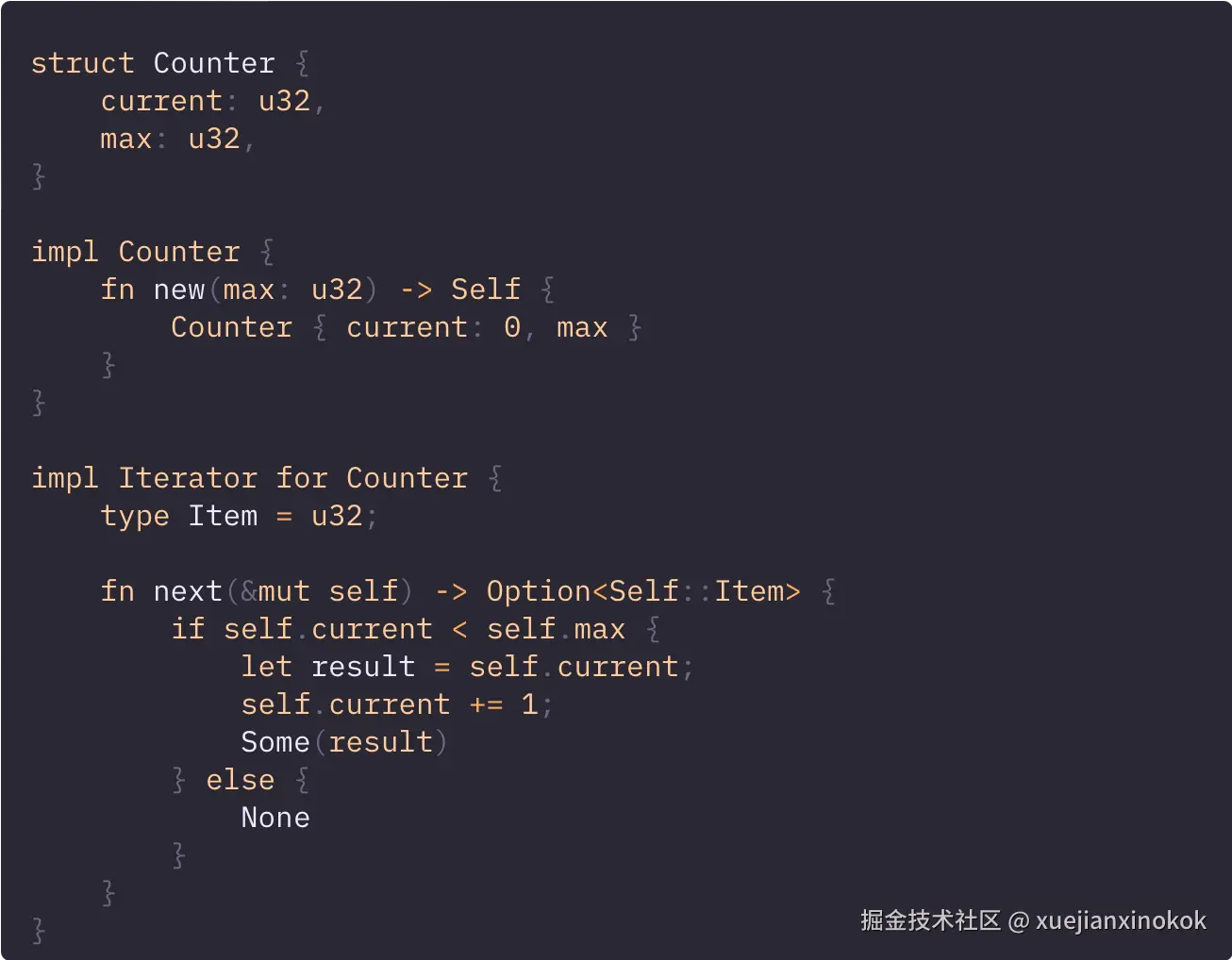 Rust 中的迭代器由 Iterator trait 定义,该 trait 只需要实现一个方法:next()。此方法指定如何推进迭代器并返回下一个元素。