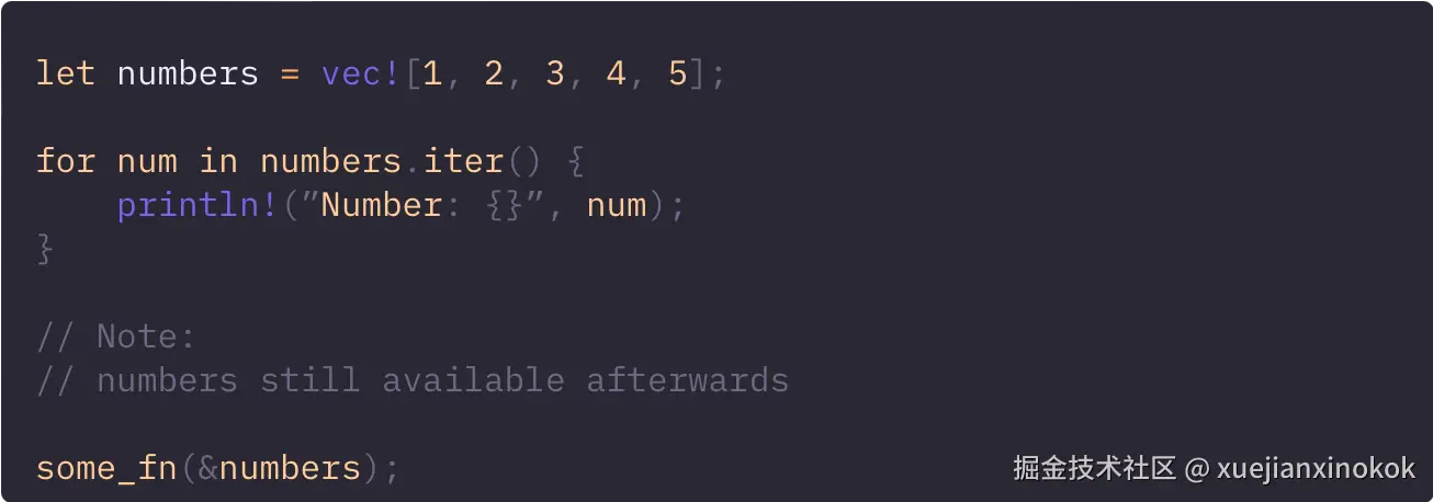 iter() 方法允许遍历集合,同时将每个元素作为不可变引用借用。