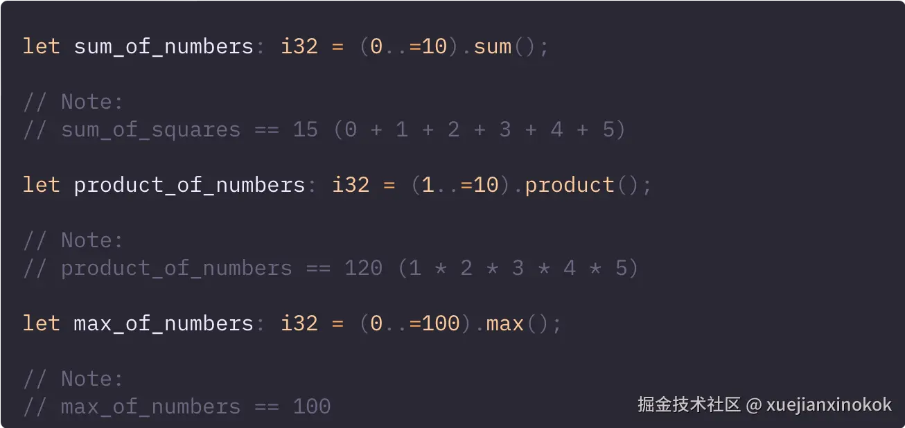 Iterator trait 包含额外的内置方法,使我们能够避免重新实现基本功能,例如数字的求和或乘积(类似于我们上面使用 fold(initial, fn) 的实现)。