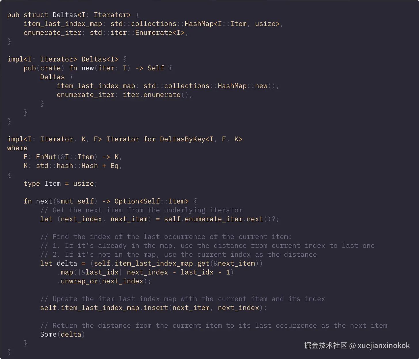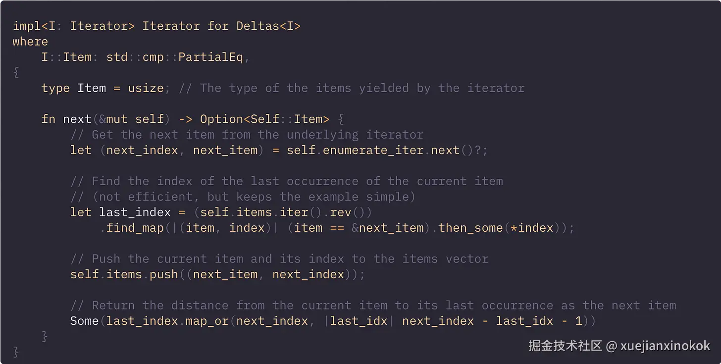 现在我们有了 Deltas struct,剩下的唯一一件事就是为其实现 Iterator trait。