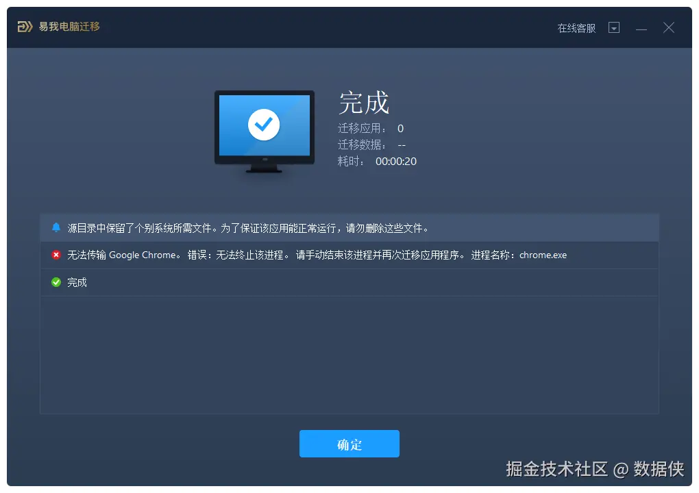 确保要迁移的程序已经完全退出,否则将会导致迁移失败。