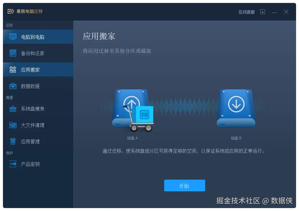 步骤2:选择“应用搬家”,点击“开始”按钮。