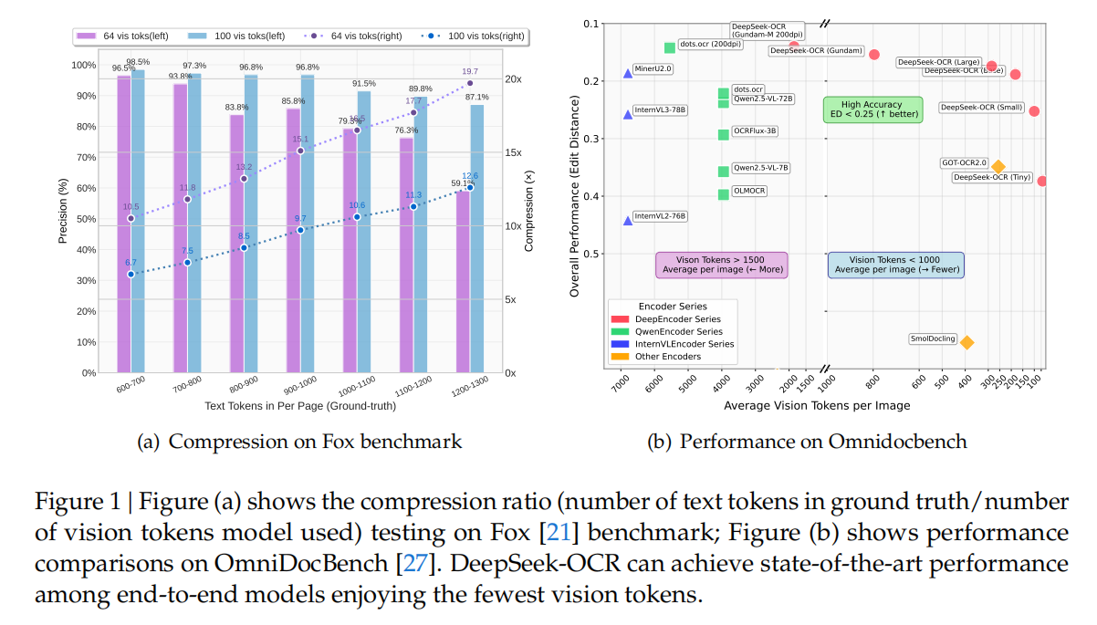 实验数据令人印象深刻:当文本Token数量在视觉Token的10倍以内(压缩率<10×)时,模型的解码精度可达97%;即使在压缩率达到20×的情况下,OCR准确率仍保持在约60%。