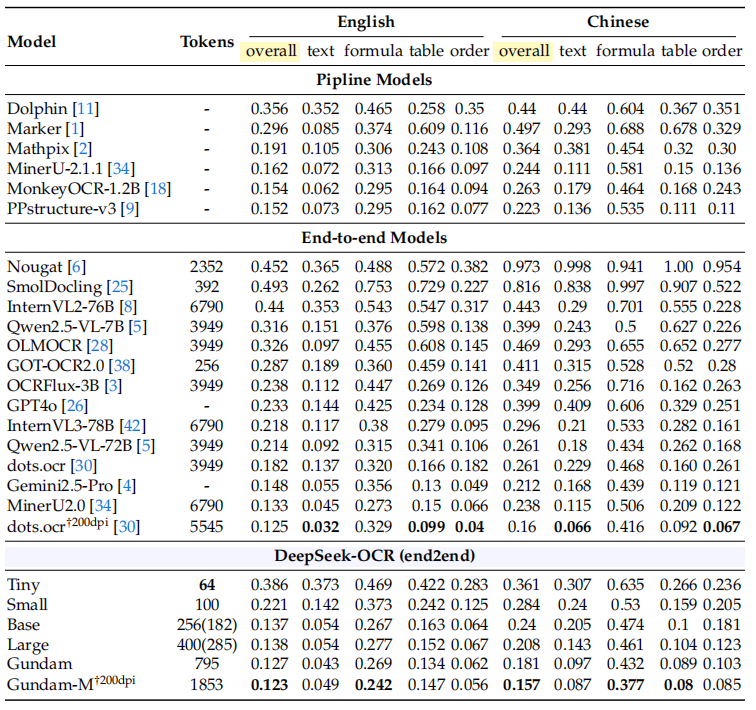 - 极致的token效率:在OmniDocBench基准测试中,它仅用100个视觉token就超越了需256个token的GOT-OCR2.0;面对MinerU2.0平均每页6000+token的消耗,它用不到800个token就能实现更优性能——相当于将文本处理的“token成本”降低了7-20倍。