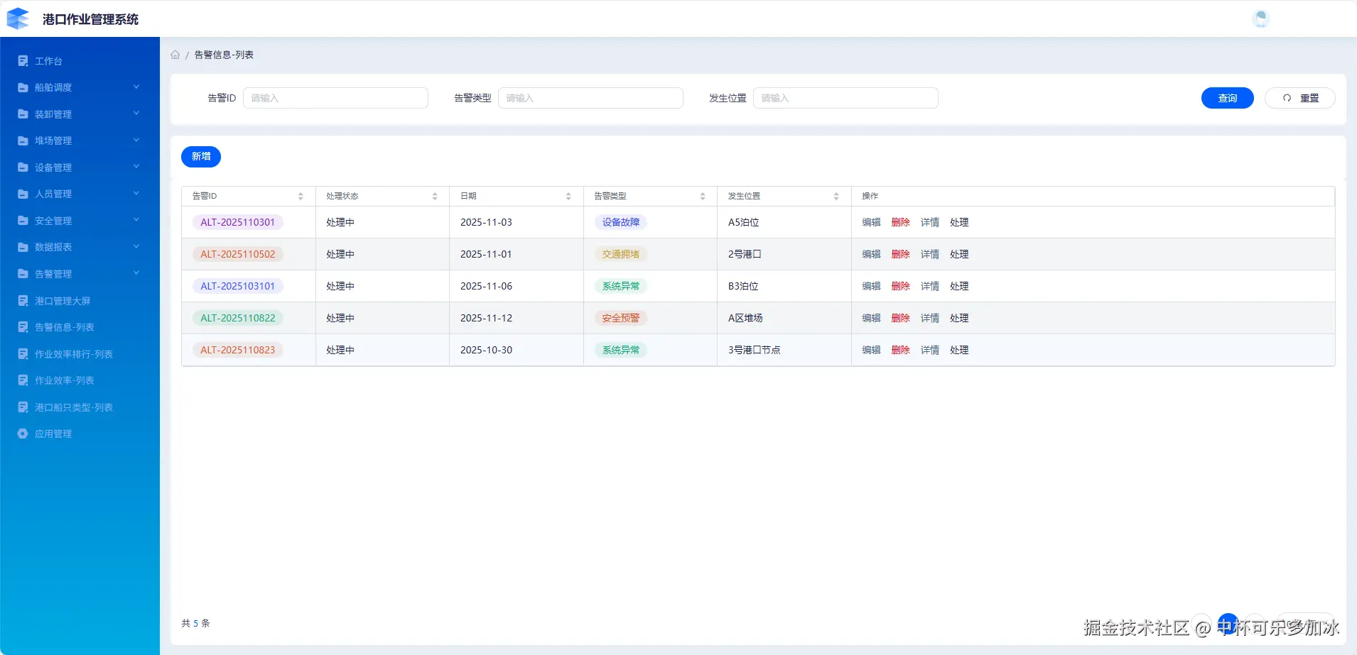 - 告警信息中心:实时呈现港口异常事件,支持一键穿透处理;