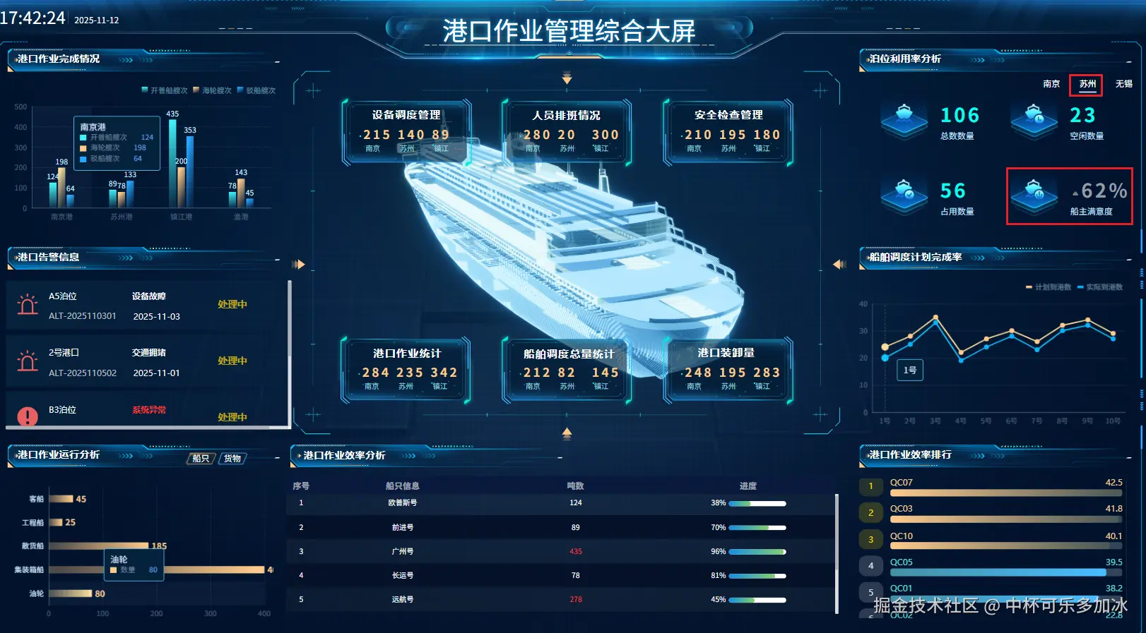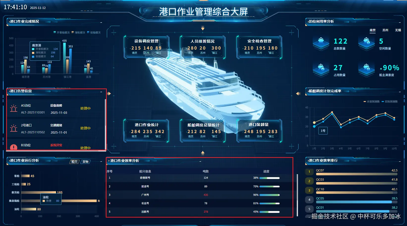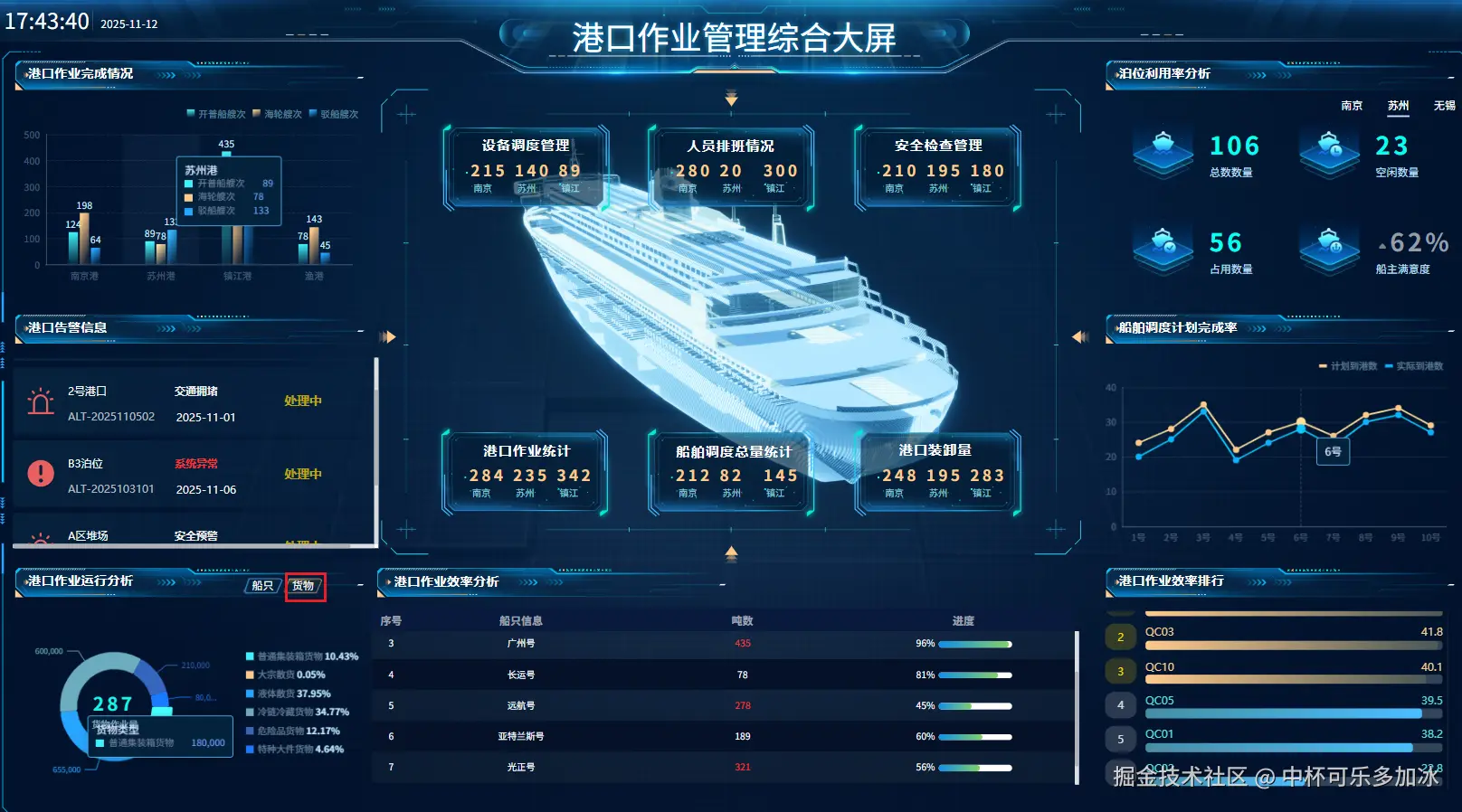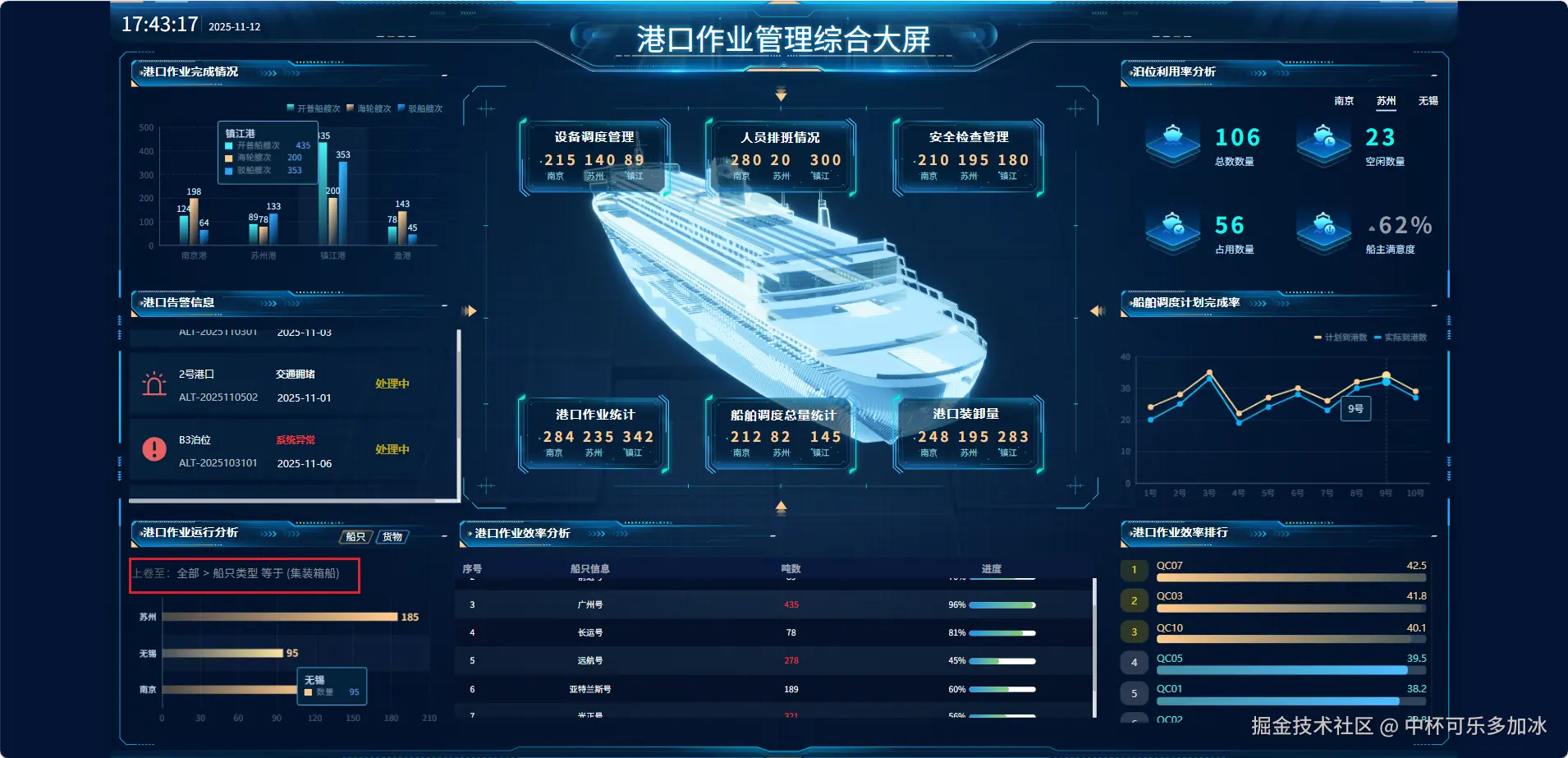 - 船舶状态监测:通过表格与进度条直观展示船舶作业进度与吨位分布;
