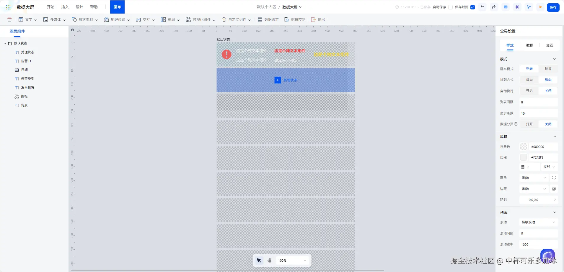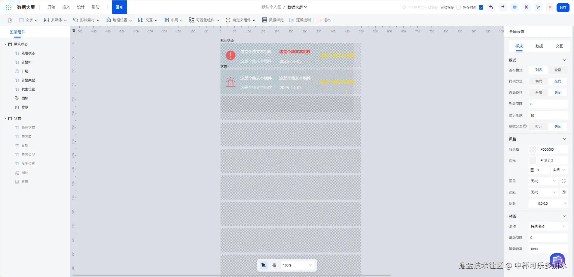 在屏幕左侧区域的告警信息模块,我们采用画布组件实现更自由的布局与更直观的视觉呈现。