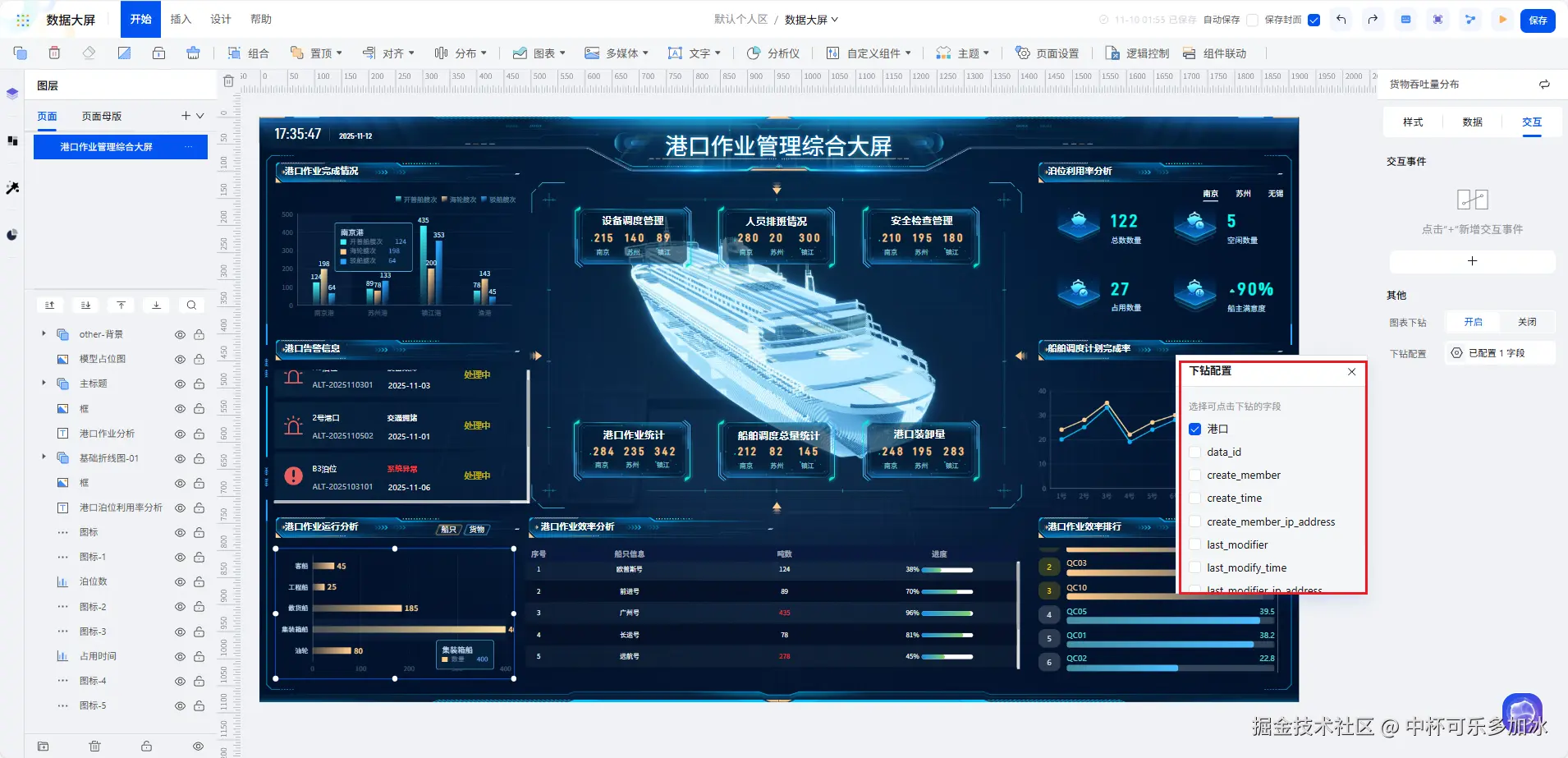 - 交互事件配置:设置点击下钻、页签筛选、开关切换等交互逻辑,实现数据联动。