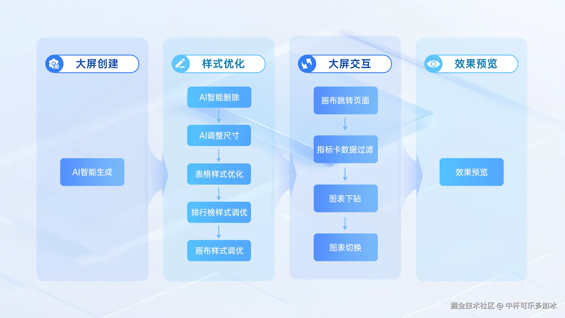 - 大屏框架生成:利用AI指令快速生成大屏布局、图表与样式;
