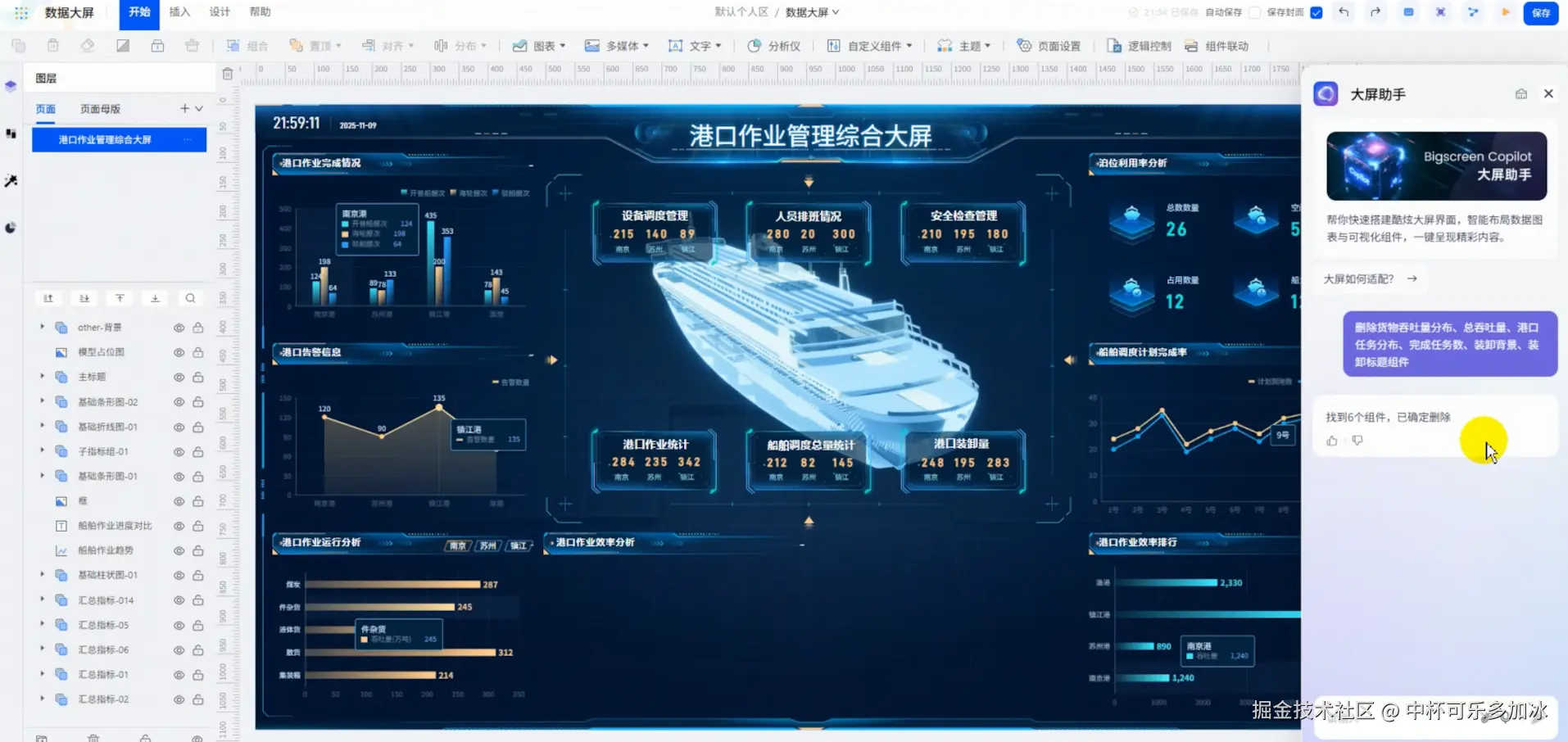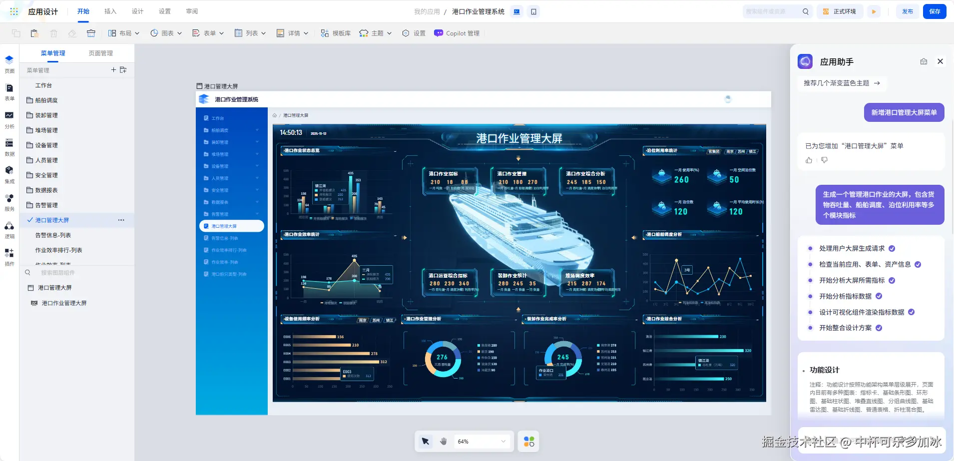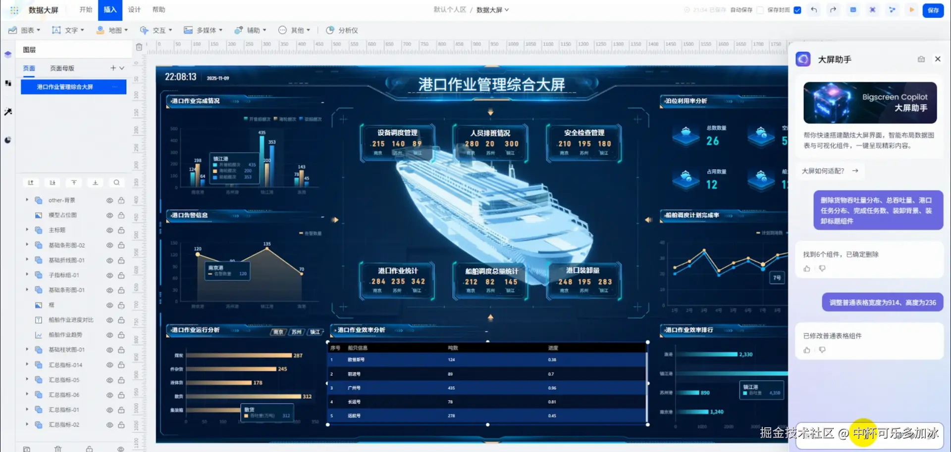 进入应用设计界面,唤起右下角的AI助手,输入大屏生成指令:“生成一个管理港口作业的大屏,包含货物吞吐量、船舶调度、泊位利用率等多个模块指标”