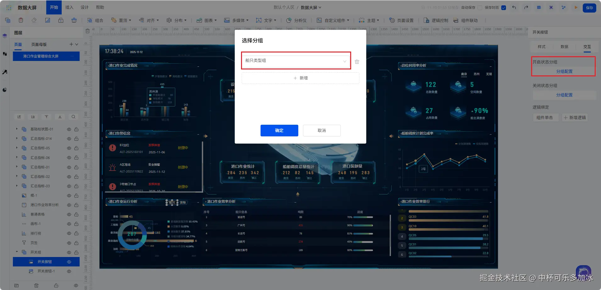 通过两个开关组件实现同一区域的图表切换展示,节省大屏空间。将"船只分析"开关关联到船只类型柱状图,"货物分析"开关关联到货物类型环形图。并设置互斥显示规则,用户只需轻点开关,即可在船舶分析与货物分析两种视角间自由切换。