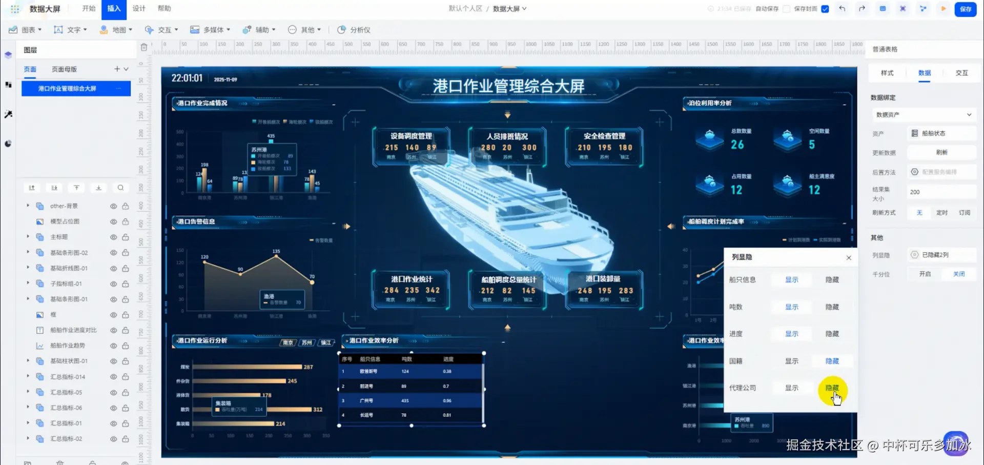 随后拖入表格组件,绑定船舶实时数据资产,手动隐藏"国籍"、"代理公司"等非核心字段,确保表格信息聚焦。
