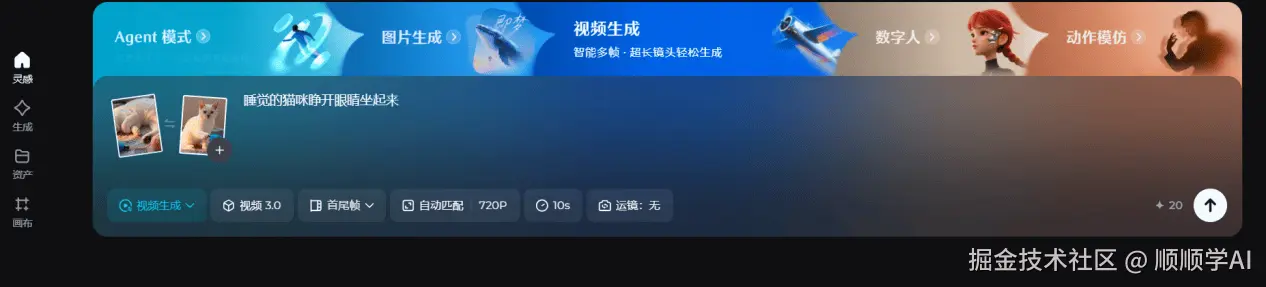 - 第一步:选模式。 打开工具后选择【视频生成】,可切换两种核心模式 —— 普通模式(单图生视频)或首尾帧模式(如 “猫咪闭眼→睁眼” 动态过渡);