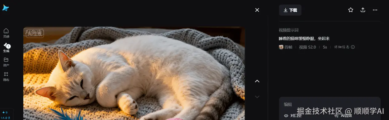 - 上传猫咪图片,输入提示词:“猫咪尾巴轻轻晃动,眨眼,镜头轻微拉近”;