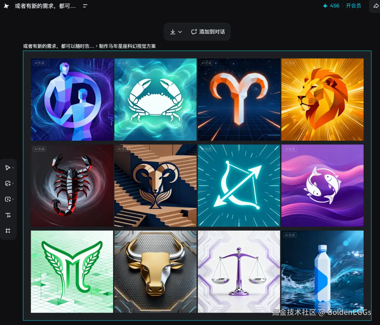 当你提出需求:“为一个科幻主题品牌设计一组视觉延展方案”,智能体不仅能自动生成多套视觉设计,还会提供不同风格建议: 未来感、极简风、赛博朋克、东方金属光泽等。