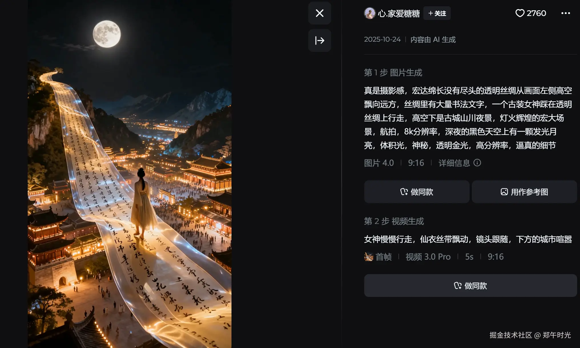 灵感里面有喜欢的图或视频,直接点开,不仅能看到提示词,还能直接拿来用,太方便了!