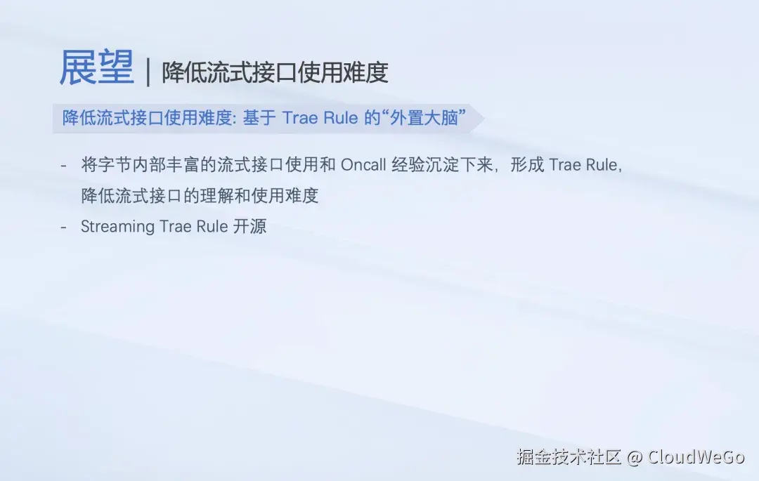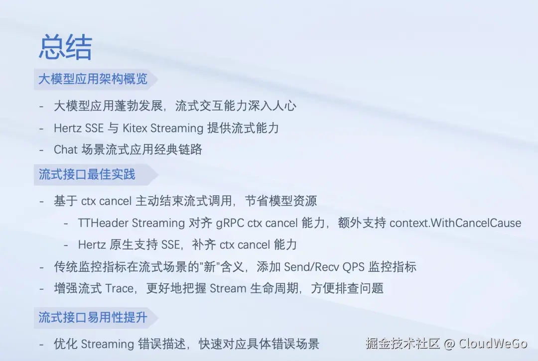 本次分享围绕三大板块展开:一是大模型应用框架的流式能力与经典链路,明确 Kitex 与 Hertz 的核心支撑作用;二是流式工程实践增强,通过会话中断控制、异常定位优化、监控能力升级,保障大模型应用稳定落地;三是流式能力与生态升级,以 StreamX 新接口、自研 TTHeader Streaming 协议、完善流式生态,实现流式能力从 "可用" 到 "好用" 的跨越。展望未来,服务框架团队将开源流式最佳工程实践并发布配套使用指南,推出 Metrics/Trace 的 open-telemetry 版本,持续迭代 TTHeader Streaming 协议、优化 WebSocket 支持,进一步完善流式生态,为更多大模型应用提供高效、可靠的技术支撑。